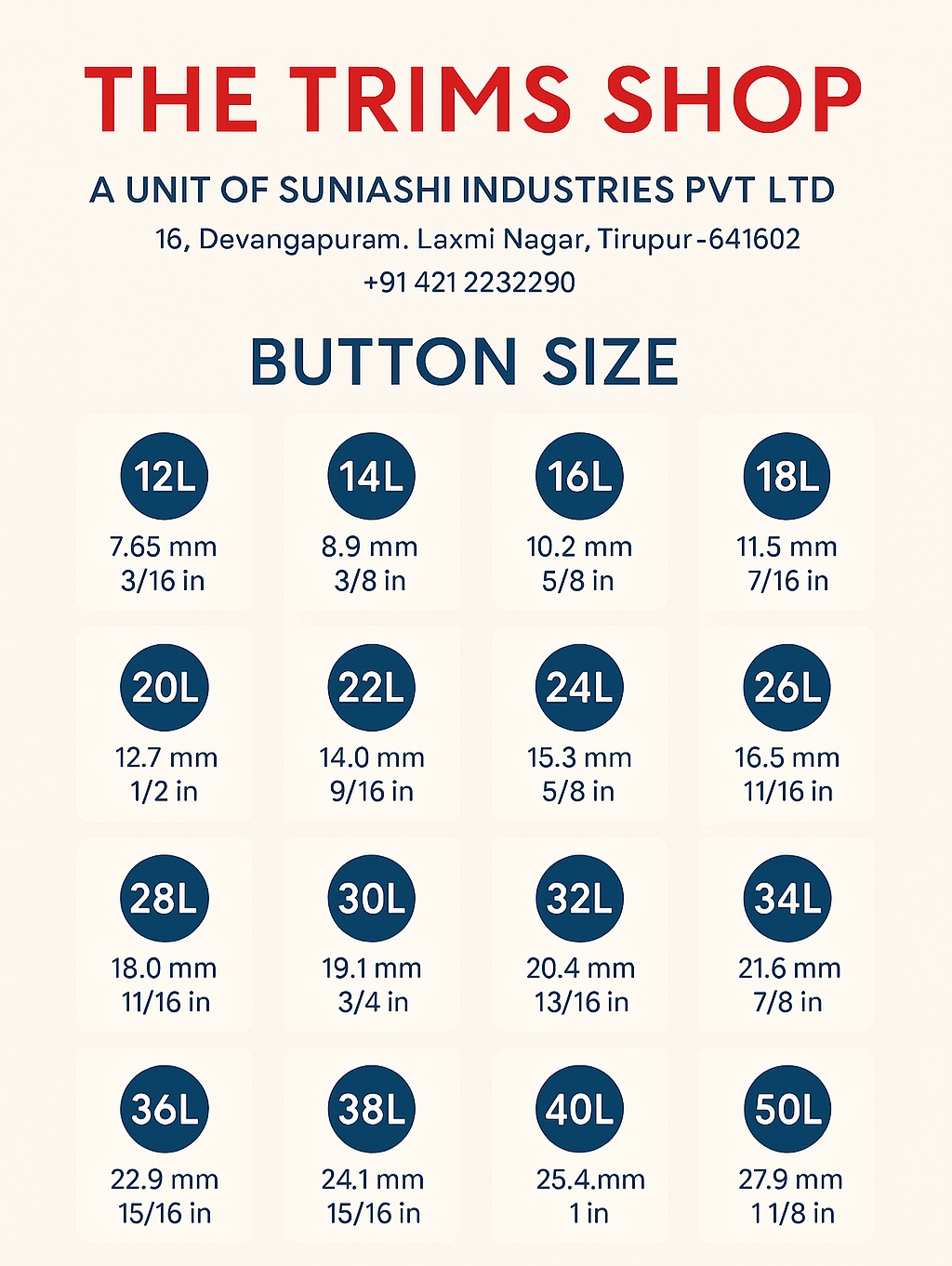 As a resource for designers and manufacturers, we offer a comprehensive **Sewing Button Size Chart**. This chart provides standard measurements in both **lignes (L)** and **millimeters (mm)**, along with approximate inches, to help you accurately select the perfect button for your garment trims and apparel projects.